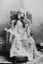 Date: 17 July 1897. Occasion: The Devonshire House Ball, 2 July 1897. Location: The Lafayette Studio, 179 New Bond Street, London, W. Descr: FL, standing. Costume: "...under-dress of Eastern fabric, cream worked in squares of green and gold, and draperies from the neck of green and mauve." (The Gentlewoman, 8 January 1898, p 59a).(3) Costume Designer: Jean Joseph Benjamin-Constant.(4) Costume Supplier: J.P. Worth, Paris. Accessories: Orb based on the Sovereign's Orb, 1661, and Queen Mary's Orb, 1689, (Tower of London); Madonna lily. Furniture & Props: Painted backdrop; studio Italian renaissance-style cassone; studio Persian rug.