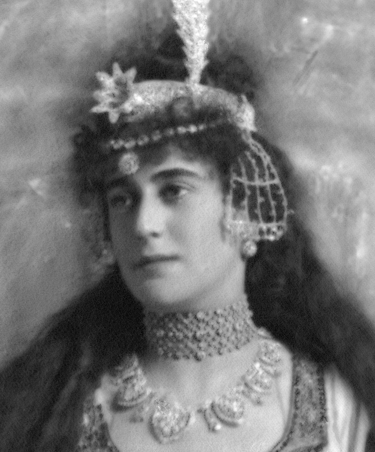Photographer: The firm of J. Lafayette, 179 New Bond Street, London, W. Evidence of photographer at work: Right edge of backdrop visible to the left of the plate; strings of photographer's tent visible on left in front of the backdrop; note also retouching work to the backdrop.